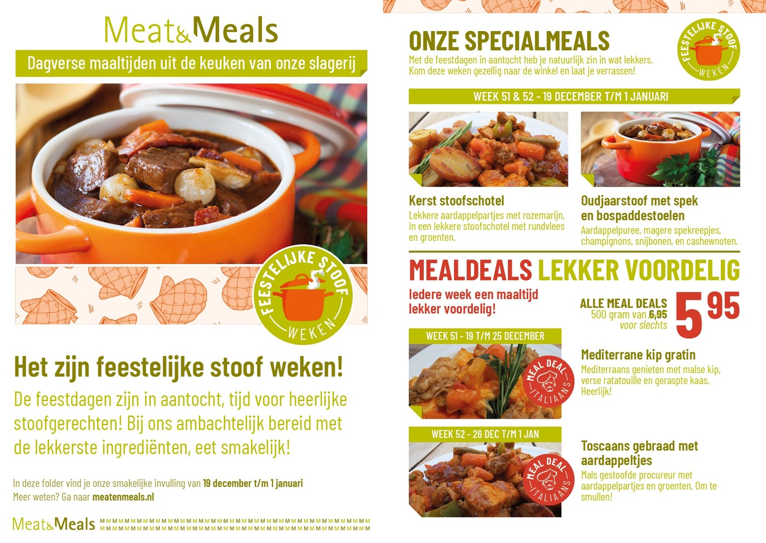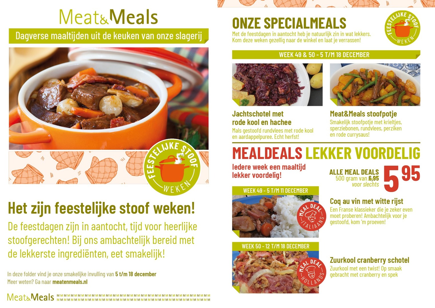 Deze weken heeft u extra veel keuze uit heerlijke huisgemaakte maaltijden! Kom lekker uitzoeken in de Meat&Meals winkels.